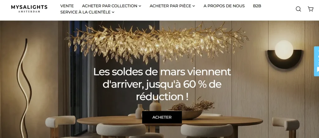 La boutique mysalights.com présente une interface visuellement travaillée, avec des photographies de luminaires en situation dans des intérieurs contemporains. Cette mise en scène professionnelle donne une première impression de sérieux comparable à celle des grandes enseignes de décoration.